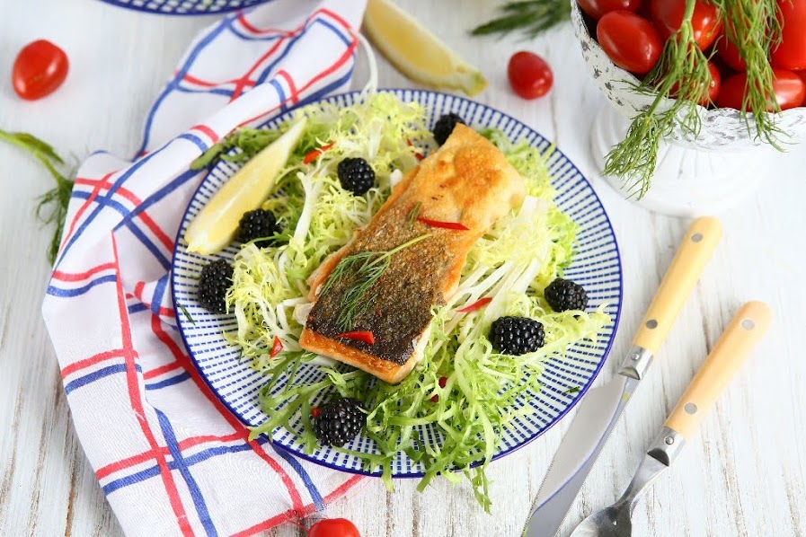 - Meanwhile, combine curly endive, blackberries or grape tomatoes. Divide into two serving plates and top with salmon. Garnish with lemon wedges, shredded chilli pepper and dill fronds.