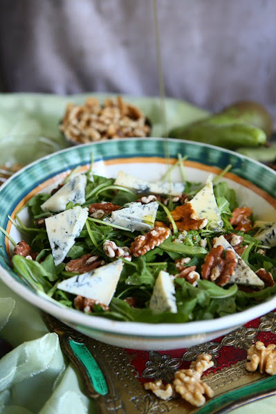 - Place arugula, toasted walnuts and blue cheese in a salad bowl. Drizzle some prepared dressing over and gently toss to coat.